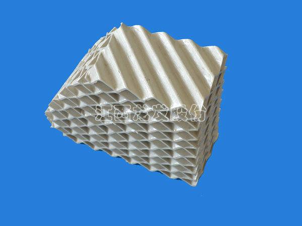 陶瓷規(guī)整填料是一種在培內以均勻幾何圖形排布,整齊堆砌的培填料。規(guī)整填料主要是取代塔內散堆填料,解決阻力大、比表面積小,傳質效能差、易破碎等突出問題。它規(guī)定了氣液流路.改善了淘流、壁流和潤濕性能.降低了阻力,同時提供更多的氣液接觸面積從而提高了傳質,傳熱效果。可廣泛用于煤氣洗滌塔.焦化洗滌,洗苯、洗氨培、化肥熱氣飽和、脫硫酸、硫酸干燥、吸收塔等。陶瓷波紋規(guī)整填料是用硬質瓷構成,主要成分粘土、石英、長石等經特殊烘燒而成。其形成是由許多具有相同幾何形狀的單元體波紋片相互平行,叉疊加組成。